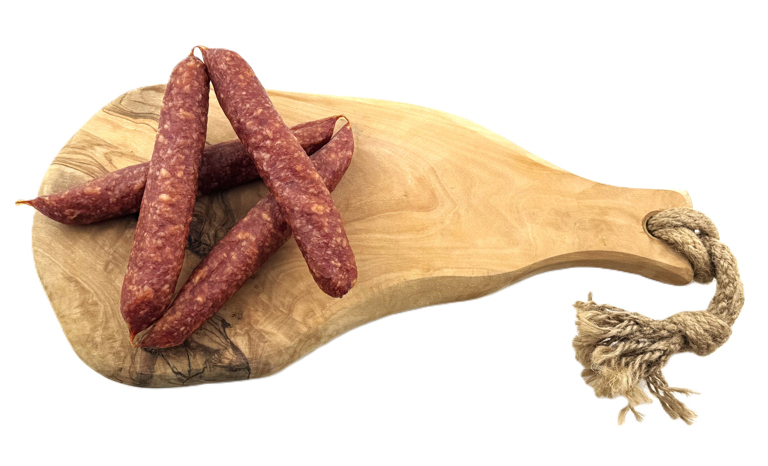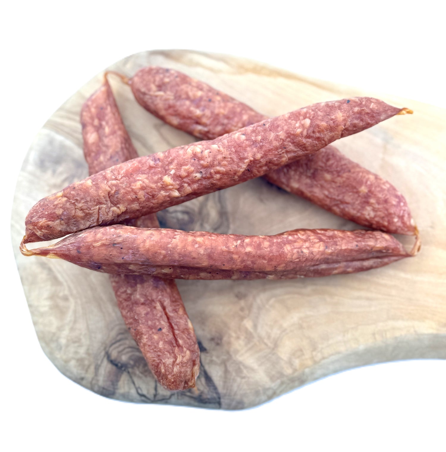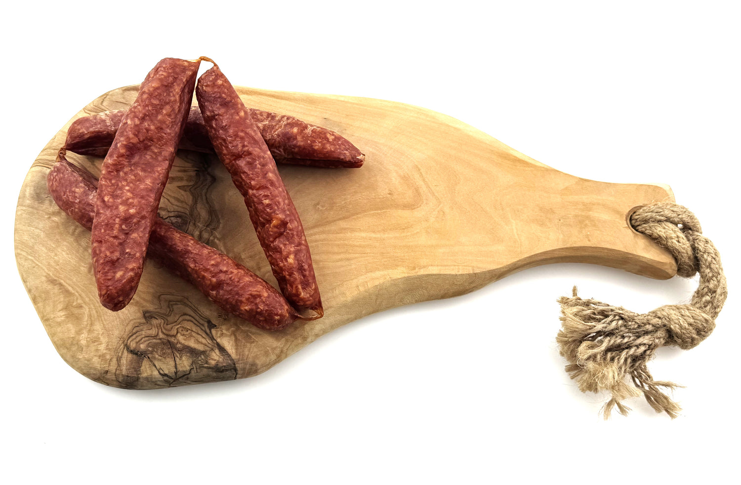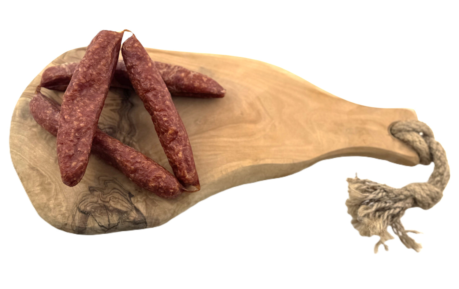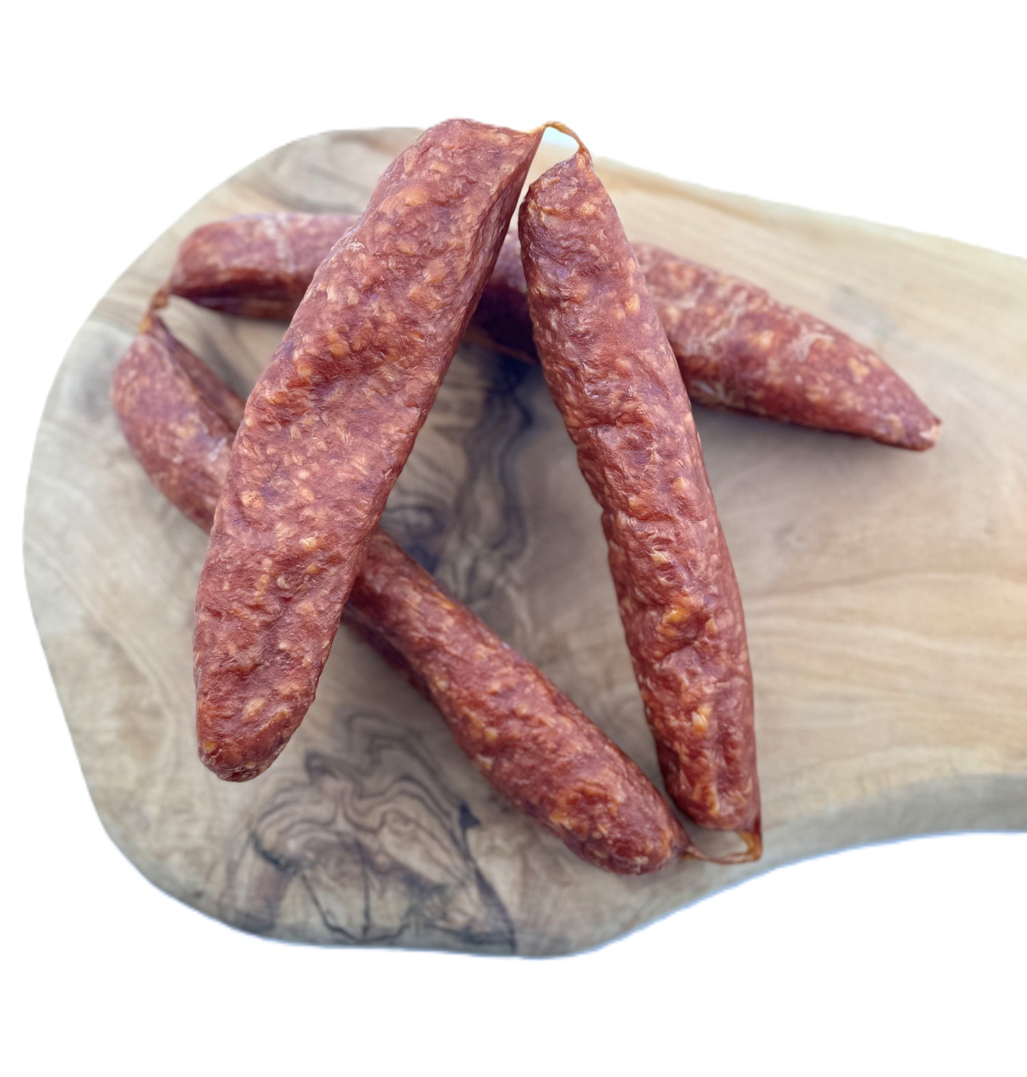 Pikante droge worsten, vervaardigd uit 80% zuiver varkensvlees en 20% vet. Deze unieke creatie combineert de perfecte vlees-vetverhouding met een gedurfde mix van kruiden die een vurige smaakexplosie creëren. Laat je smaakpapillen dansen met elke hap van onze ambachtelijke pikante droge worsten